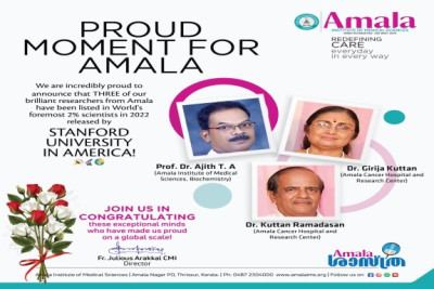 അമേരിക്കയിലെ സ്റ്റാൻഫോർഡ് സർവകലാശാല പുറത്തുവിട്ട 2022ലെ വിവിധ ശാസ്ത്രശാഖകളിലെ ലോകത്തിലെ ഏറ്റവും മികച്ച 2% ശാസ്ത്രജ്ഞരുടെ പട്ടികയിൽ അമലയിൽ നിന്നും 3 ഗവേഷകർ.