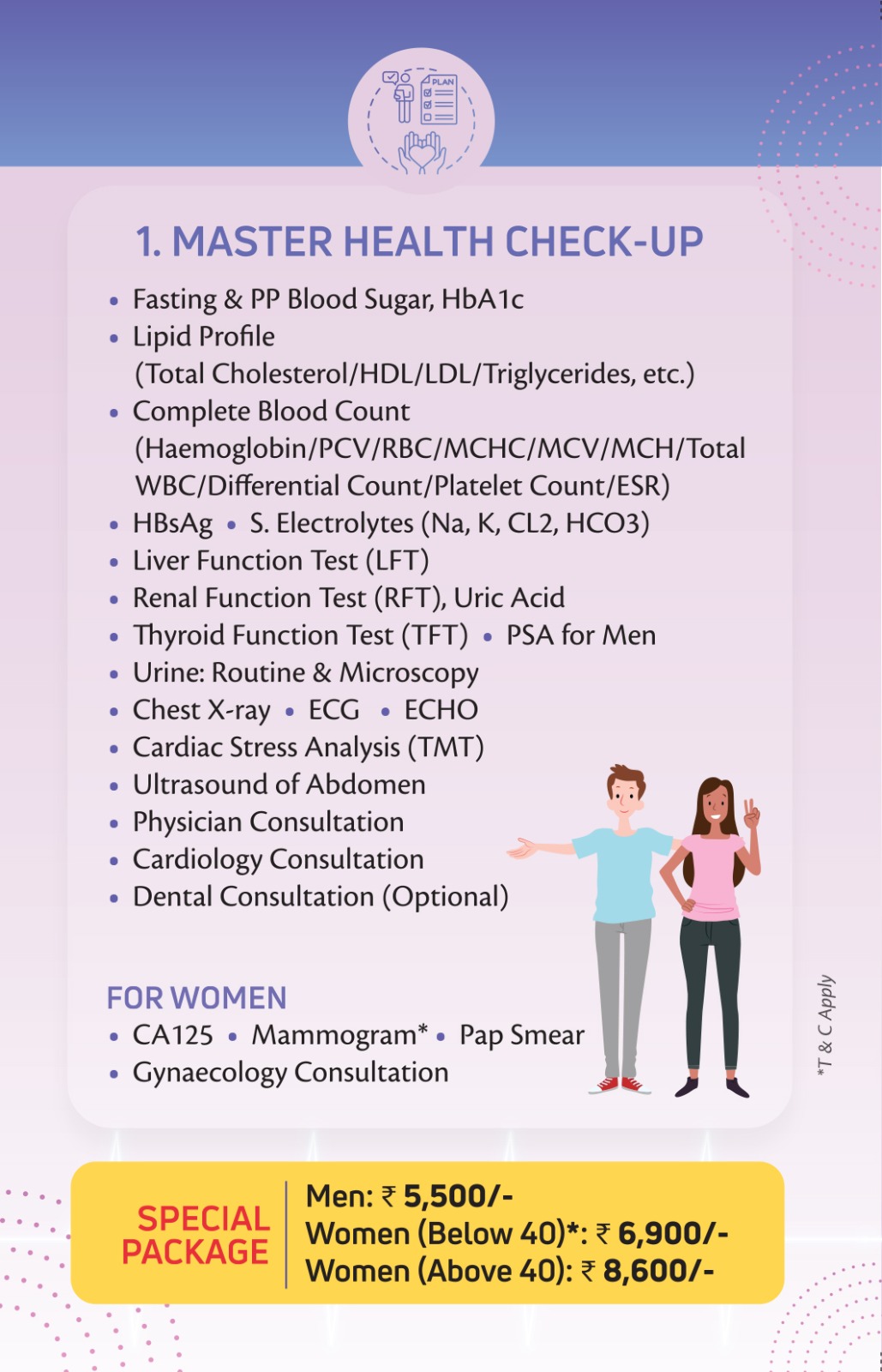 A master health examination consists of a variety of medical tests used to evaluate a person's overall health. The master health checkup comprises a physical examination, ultrasound, and laboratory tests that assess the condition of your metabolism and important organs to find any early signs of illness and improve personal health management.